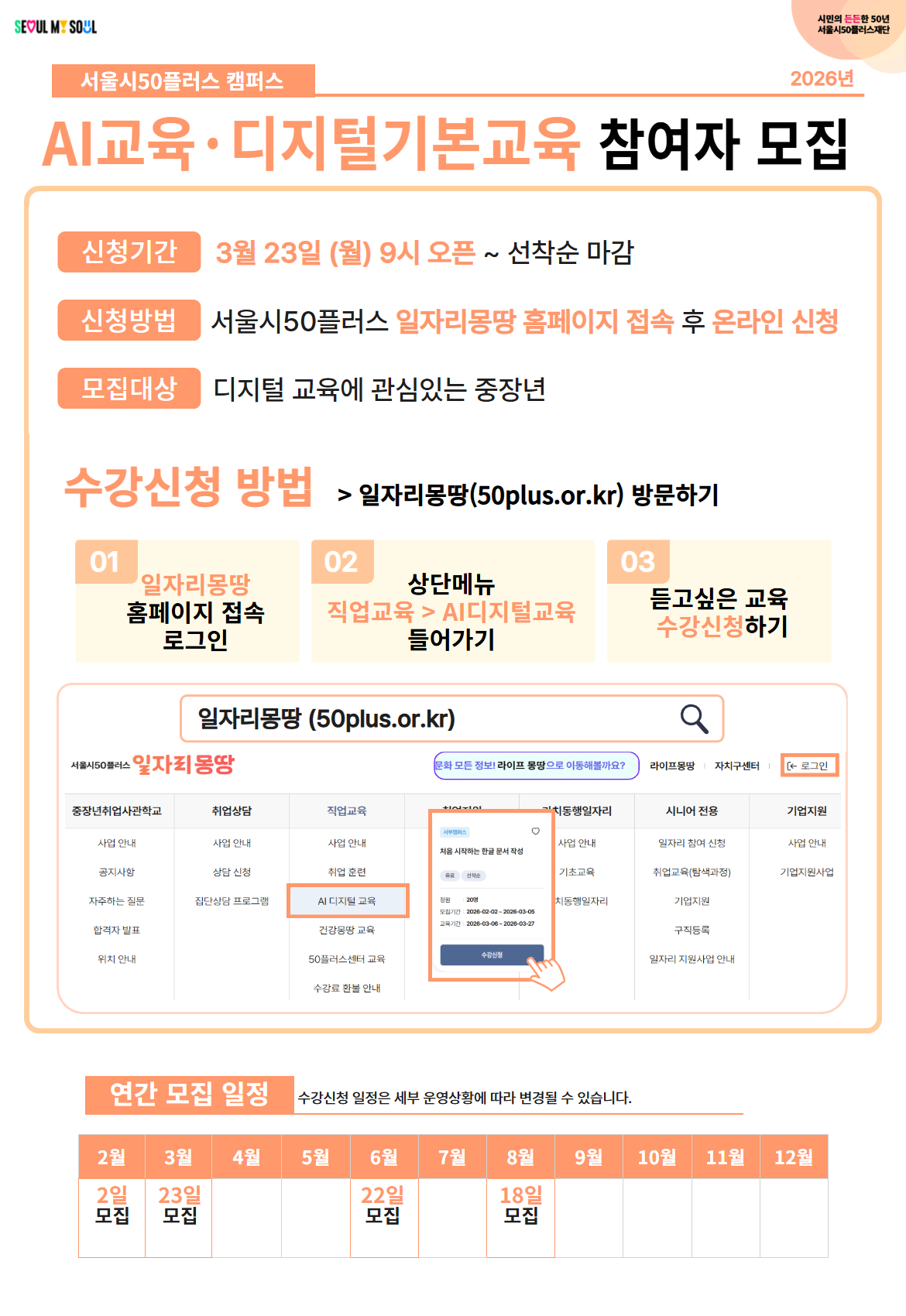 [일자리정보몽땅][모집]2026년 서울시50플러스 AI교육 · 디지털 기본교육 참여자 모집