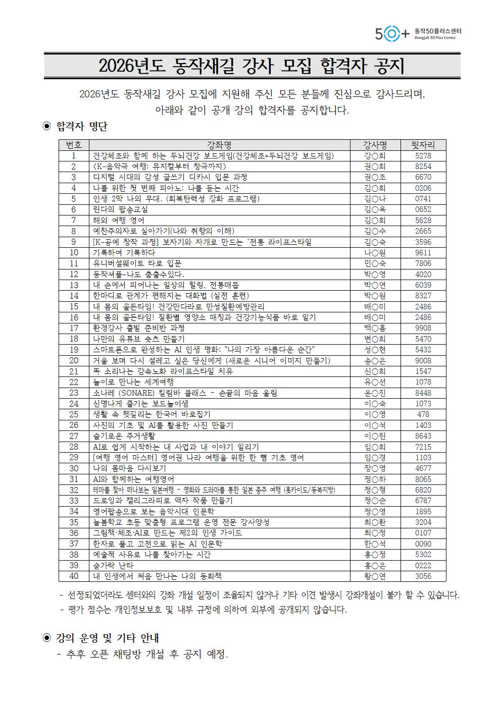 서울시 동작센터 | 2026년 동작새길 강사모집 합격자 발표