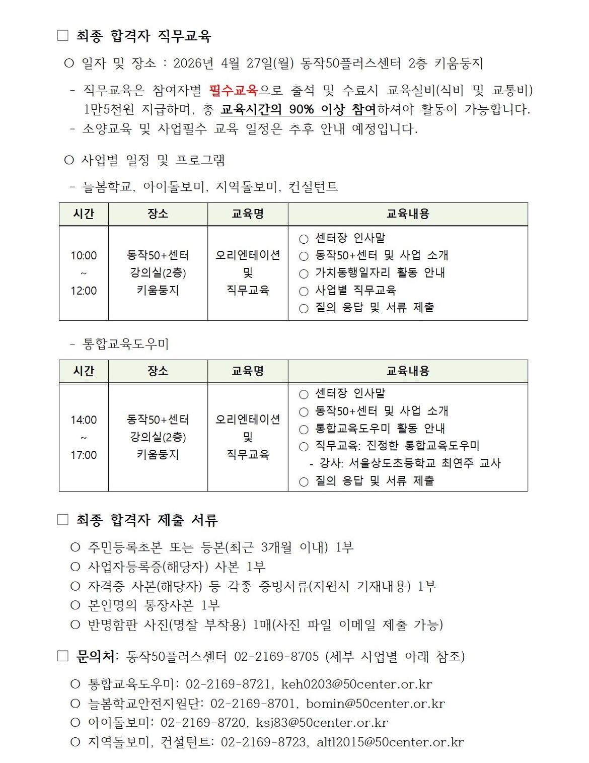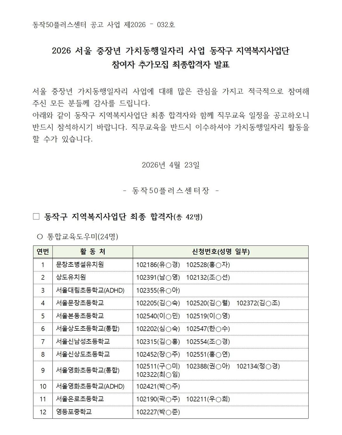 서울시 동작센터 | 2026 서울 중장년 가치동행일자리 사업 지역복지사업단 추가모집 최종합격자 공고