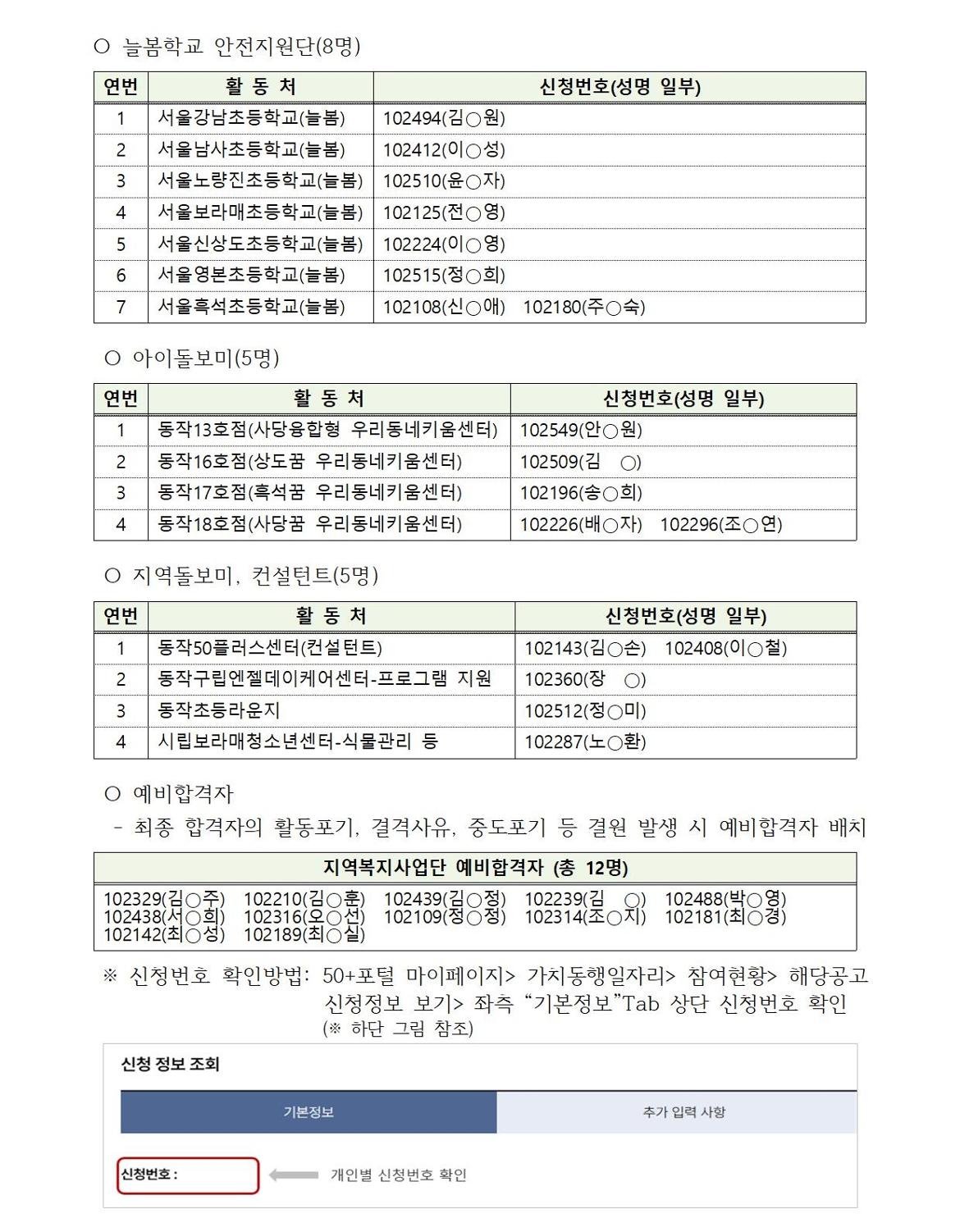 동작50플러스센터, 서울시 보람일자리, 합격자공고