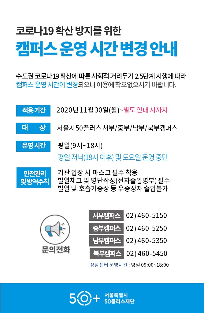 [재단]서울시50플러스 캠퍼스 운영시간 변경 안내(11.30~별도 안내 시까지)