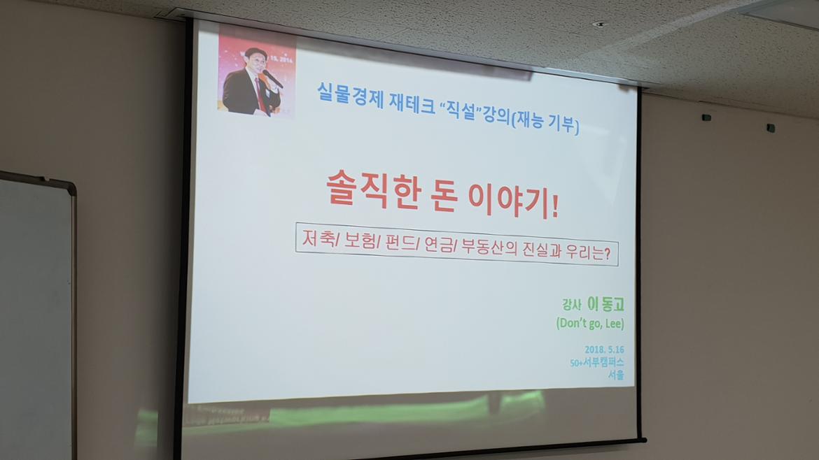 서부캠퍼스를 찾았다. 인터뷰에 앞서 그의 특강을 먼저 들어보았다. '솔직한 돈 이야기 - 저축, 보험, 펀드, 연금, 부동산의 진실과 우리는?'이라는 직설적인 주제 때문인지 봄비가 제법 굵게 오는 날이었음에도 좁은 강의실은 금세 가득 찼다.