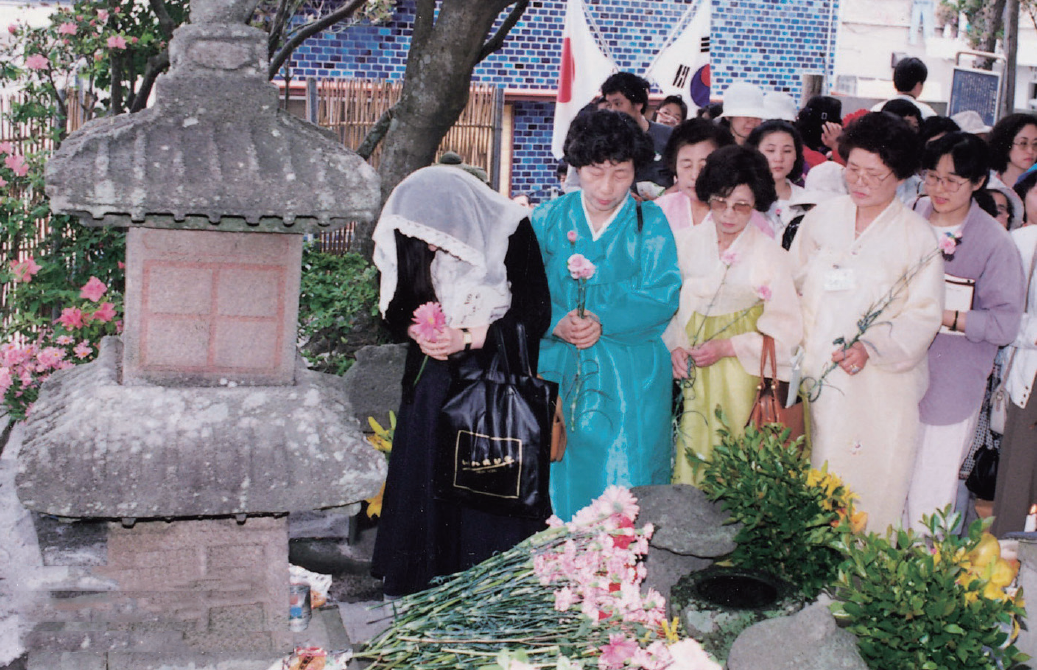 <오타 줄리아 제 미사를 마친 한일 가톨릭 신자들이 오타 줄리아 묘에 헌화하고 있다.>