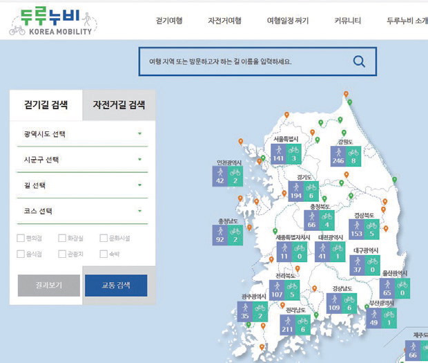 걷기와 더불어 자전거 길까지 교통, 숙박, 음식, 문화 관련 정보를 한꺼번에 검색할 있는 사이트다. 길 이름으로 검색하거나 지도에 표시된 아이콘을 클릭해 지역에 따라 코스 찾기가 가능하다. 코스에 대한 소개 글과 사진, 지도, 거리, 시간, 난이도, 편의시설 등에 대한 기본 정보와 전문가 평점까지 골고루 담았다. ‘여행일정 짜기’, ‘이달의 추천 길’ 등을 이용하면 더욱 수월하게 도보여행 계획을 있다.