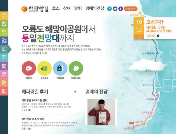 해파랑길은 부산 오륙도 해맞이공원을 시작으로 강원도 고성 통일전망대에 이르는 770km 장거리 도보여행 길이다. 고성 구간, 울진 구간, 포항 구간 크게 10개 구간으로 나뉜 50개의 코스가 있다. 사이트에서는 구간별 거리와 소요시간, 난이도를 비롯해 지역별 대표 연락처와 구간 교통편 확인이 가능하다.
