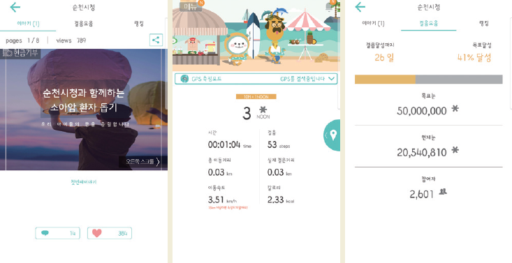 걸을 때마다 포인트가 적립되고, 모인 포인트만큼 환산된 금액을 기부한다. 절단장애 아동을 위한 의족 마련, 아프리카를 위한 식수 지원 다양한 곳에 기부 참여가 가능하다.