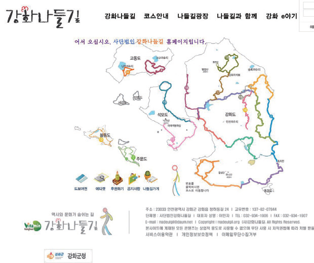 ‘나들이 가듯 걷는 길’이라는 뜻을 지닌 강화나들길은 총 20개 코스로 연결돼 있다. 선사시대 고인돌과 고려시대 왕릉 유적지와 함께 저어새, 두루미 천연기념물 철새가 서식하는 자연환경까지 경험할 있어 아이들과 함께 걷기에 좋다. 사이트에서는 코스별 지도, 거리, 소요시간, 난이도, 주변 볼거리 등을 확인할 있다. 또, 걷기 모임 일정과 더불어 ‘나들길지기’의 연락처와 콜버스 전화번호를 알려준다.
