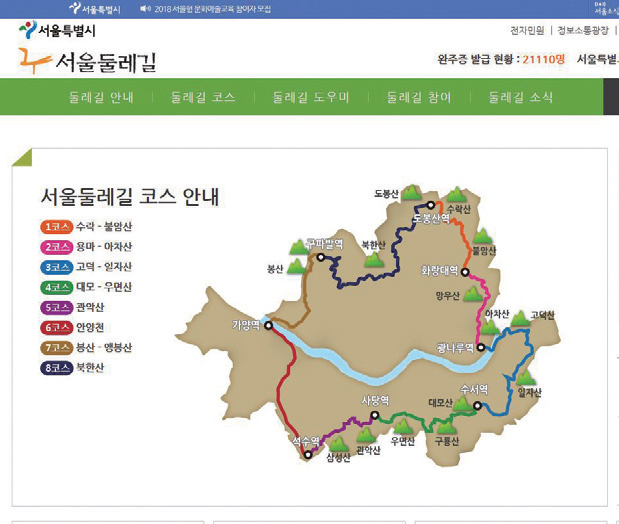 서울둘레길, 한양도성길, 근교산자락길, 생태문화길, 한강·지천길 서울의 도보 코스 정보를 한눈에 있다. 서울둘레길 8개 코스의 지도와 거리, 소요시간을 비롯해 난이도, 진입로 교통정보, 주변 볼거리 등의 정보를 제공한다. 해당 자료는 그림 파일로 다운로드 출력 가능하다. 한양도성길의 경우 서울두드림길 홈페이지를 통하거나 도메인(seoulcitywall.seoul.go.kr)을 직접 입력해 접속하면 된다.