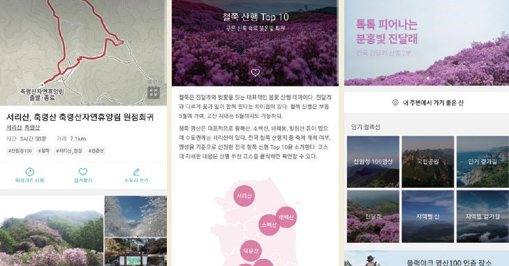 조깅, 마라톤, 자전거 다양한 모드로 운동 이력을 관리할 있다. 특히 또는 봉우리까지 가는 길을 알려주는 ‘등산내비’ 기능이 있어 산에서 찾기도 문제없다. 운동 목표를 달성하면 기록 인증 배지를, 전국 5500여 산봉우리에서는 방문 인증 배지를 발급해주는데 차곡차곡 ‘배지함’에 모으는 재미가 쏠쏠하다. 또 운동 성과에 따라 랭킹이 기록돼 게임처럼 순위 상승을 목표로 즐길 있다.