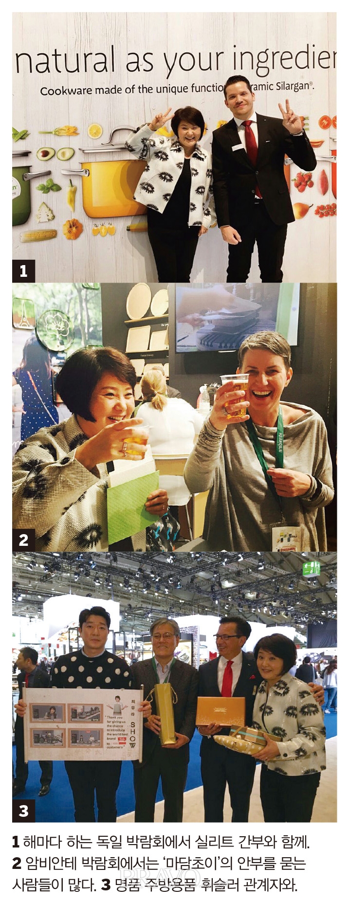 최유라의 인생도 그때를 기점으로 변했다. “그때부터 계속 해외에 나가게 됐어요. 매해 2월에 프랑크푸르트에서는 암비안테 박람회가 열려요. 세계의 주방 가전 명품이 모이는 세계 최고의 박람회죠. 물건 판매는 안 하고 계약만 체결되는 자리예요. 그러다 보니 각 업체 CEO들과 친분도 쌓게 됐어요. 참 신기한 일이죠.”
