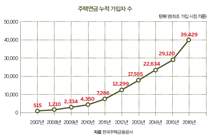 이러한 시니어 계층의 인식 변화와 더불어 주택연금 가입 건수는 갈수록 크게 늘어 나는 추세다. 2016년 신규 주택연금 가입 건수는 1만309건으로, 10년 전인 2007년 515건에 비해 약 20배 증가했다. 자녀에게 집을 물려주는 대신, 주택연금에 가입해 스스로 노후 대비를 하겠다는 인식이 빠르게 확산되고 있는 것으로 풀이된다.