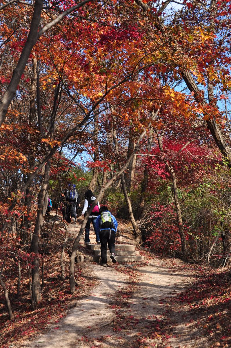 단풍구경을 하기위해 꼭 지방에 있는 산으로 갈 필요는 없다. 도심 속에도 단풍을 즐길 수 있는 곳이 제법 있다. 그 중에 하나가 인왕산과 북악산 하늘길을 따라가는 코스이다. 도심속 깊은 숲길도 체험할 수 있고, 단풍나무가 많아 유독 붉은빛을 많이 발하는 곳이다. 걷는 중간에 빠져나가기도 용이하고 걷고 싶은 만큼 걸을 수 있다. 단, 북악산 하늘길 부암동을 지나쳤다면 무조건 끝까지 가야 한다. 하늘길 중간 팔각정은 쉼터이자 서울 중심을 내려다 볼 수 있는 전망대이다. 얼룩덜룩 물든 북한산 자락에 얹혀있는 평창동 마을을 보는것도 여기서만 느낄 수 있는 풍경이다. 다양한 집 모양새가 만든 한 폭에 그림이다.