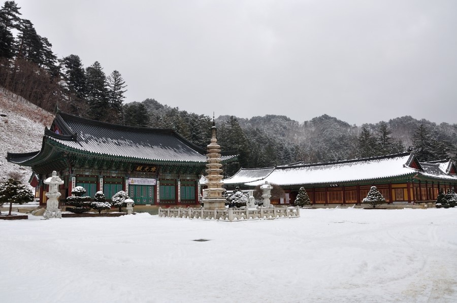 오대산 선재길은 대부분 단풍이 드는 가을에 찾아간다. 하지만 천연색을 뽐내는 가을도 좋지만 하얀 눈과 푸른 하늘만 남은 선재길은 더욱 신비롭고 고요하다. 그래서 도를 닦는 기분으로 사브작 걸을 수 있다. 맑은 물이 흐르던 계곡도 눈 속에 묻혀 고요하다. 어디서 시작해도 상관없지만 월정사 전나무 숲길을 시작으로 천천히 좁아지는 눈 쌓인 숲길을 경험하는 것도 좋을 듯싶다. 그리고 상원사 앞에 다다랐다면 대웅전에 올라서서 눈 쌓인 오대산을 내려다보는 것도 하나의 볼거리이다.