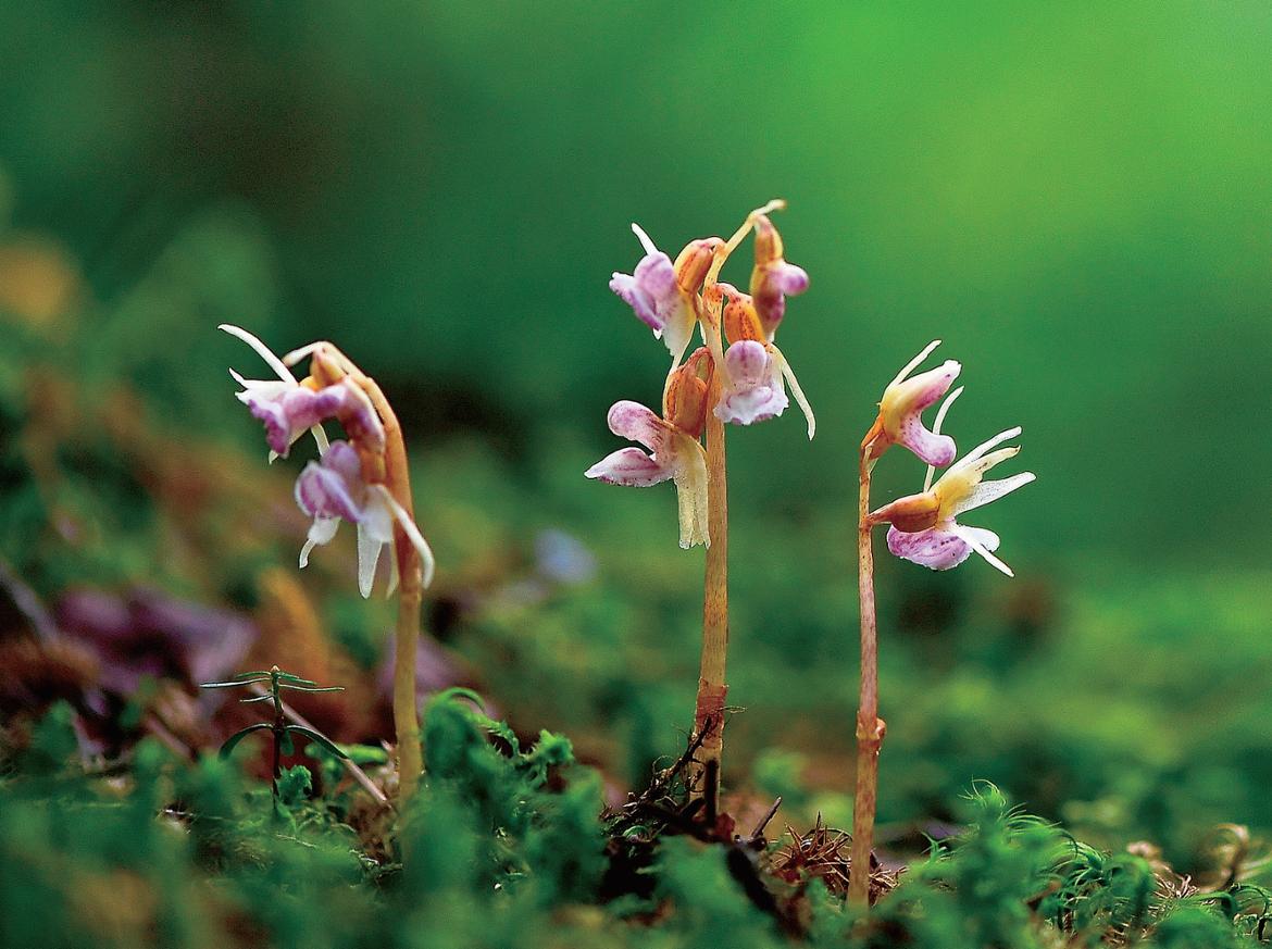 백두평원 짙푸른 숲속에 핀 유령란. 학명은 Epipogium aphyllum Sw.
