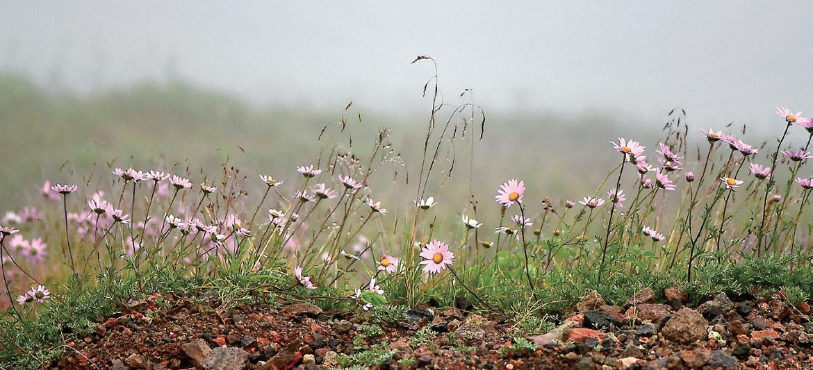 사진1)백두산 정상 2750m 능선에 핀 바위구절초. 뒤로 보이는 안개 너머로 가파른 경사면이 이어지고 그 밑에 '사진2)’처럼 천지가 펼쳐진다.