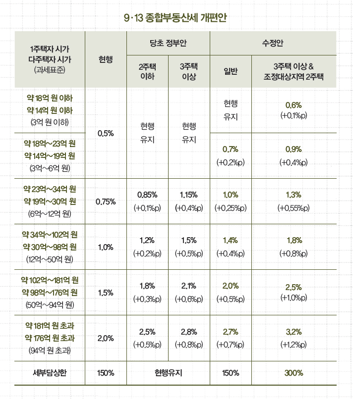 9·13 대책에 따르면 종부세 과표 3억~6억 원 구간이 신설되고, 세율은 구간별로 0.2~0.7%포인트 올라간다. 0.1∼0.5% 인상을 제시했던 정부안보다 강화했다. 과표 3억 원 초과구간에 대한 세율을 지금보다 0.2∼0.7%포인트씩 추가로 올려 최고세율을 2.7%까지 인상한다. 구간별로 과표 6억 원 초과구간에 대한 세율은 현행보다 0.1∼0.5% 인상하기로 했던 정부안보다 강화했다. 여기에 조정대상지역 내에서는 2주택 이상도 3주택 이상 다주택자와 마찬가지로 중과된다.