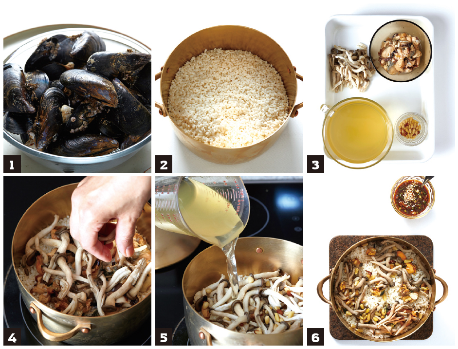 4 쌀 위에 홍합살을 얹은 뒤 느타리버섯과 잣을 올린다.