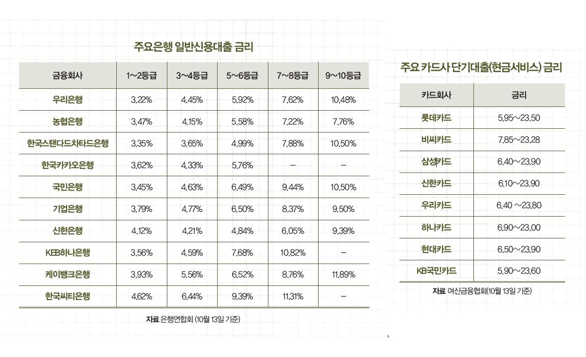 카드대출은 그동안 급전의 대명사였다. 카드 고객의 한도만 남아 있으면언제든 손쉽게 꺼내 쓸 수 있다는 점에서 애용됐다. 은행권의 대출 문턱을 넘기 힘든 고객에게도 비교적 대출 승인이 까다롭지 않게 이뤄진다는 이점도있다. 카드사의 대출금리는 평균 연 15% 내외로 이자도 상당할 뿐더러, 신용등급에도 ‘빨간 불’이 들어온다는 점을 유의해야 한다. 신용카드로 물품을 산 금액에 대해서는 연체하지 않는다면, 할부로 거래하더라도 신용에는 영향을 미치지 않는다. 하지만 현금서비스나 카드론을 사용하면 고금리 이자는 이자대로 내면서 신용등급이 하락할 위험이 높다. 소득이나 신용등급 등의 문제로 은행문턱을 넘기 어려운 경우가 아니라면,  카드대출보다는 은행대출을 활용하는게 낫다. 최근에는 인터넷 전문은행인카카오뱅크, 케이뱅크의 등장으로 24시간 비대면 대출도 가능해졌다. 여신금융협회에 따르면, 10월 13일기준 신한·KB국민·삼성·현대·우리·KEB하나·롯데·비씨(BC)카드 등8개 전업 카드사의 현금서비스 대출금리는 최저 5.9%, 최고 23.90%로 집계됐다. 평균 금리는 15% 수준이다. 반면 17개 시중은행의 일반 신용대출 평균 금리는 연 3.78%에서 최고 연6.69%로 집계됐다. 신용등급이 우수하다면 최저 연 3% 후반대에서 빌릴수 있다. 신용등급 및 소득이 낮아 제도권 금융이용이 어렵다면, 서민금융진흥원의보증지원을 통해 대출을 지원하는 생계자금 지원제도를 고려할 수 있다. 서민금융통합콜센터는 (국번 없이) 1397이다.