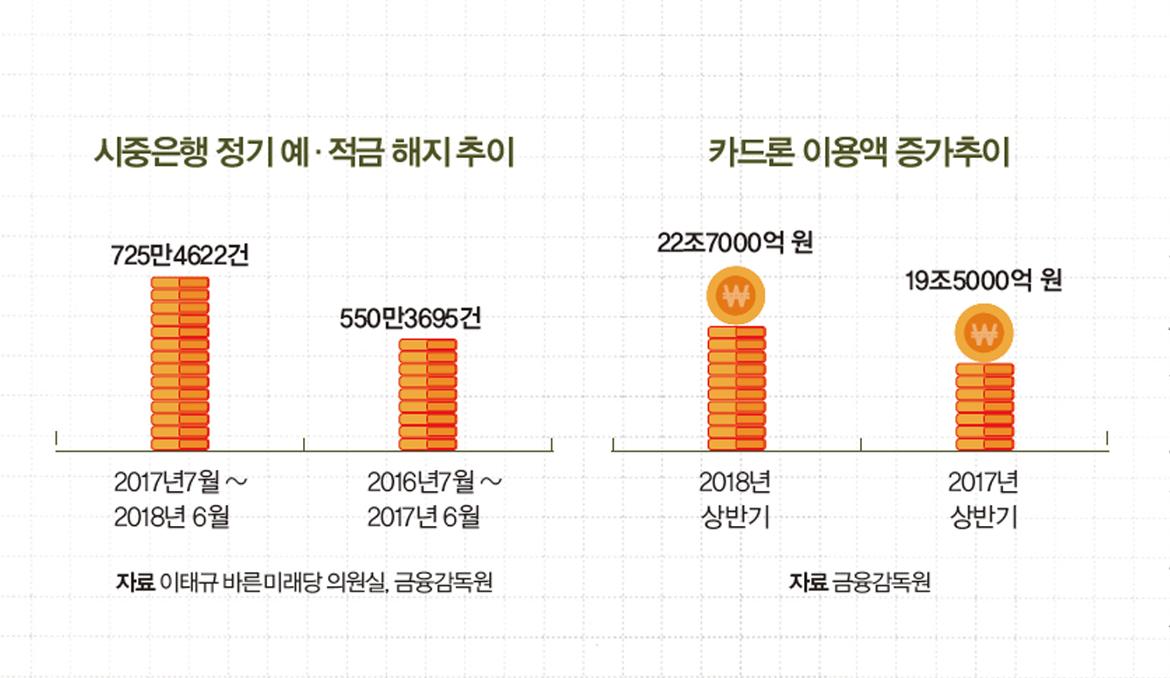 지난해 7월부터 올해 6월까지 1년 동안 시중은행에서 개인 및 개인 사업자명의의 정기예금과 적금을 중도 해지한 건수는 총 725만4622건으로 1년 전과 비교해 무려 175만927건(31.8%)이늘어났다. 손해보험사 장기보험상품의 최근 1년(2017년 7월∼2018년 6월)동안 해약 건수는 402만9737건으로1년 전보다 30만5064건(8.2%) 늘었다. 해약환급금은 15조7851억 원으로 1년 전과 비교해 3조2290억 원(25.7%) 증가했다. 카드론 이용과 연체율도 상승하고 있다. 국내 7개 카드사의 올 상반기 카드론 이용액은 22조7000억 원으로 전년동기(19조5000억 원)보다 16.4% 증가했다. 대출 잔액이 늘면서 카드론 연체율도 올라가 신용 불안의 조짐이 짙어졌다.
