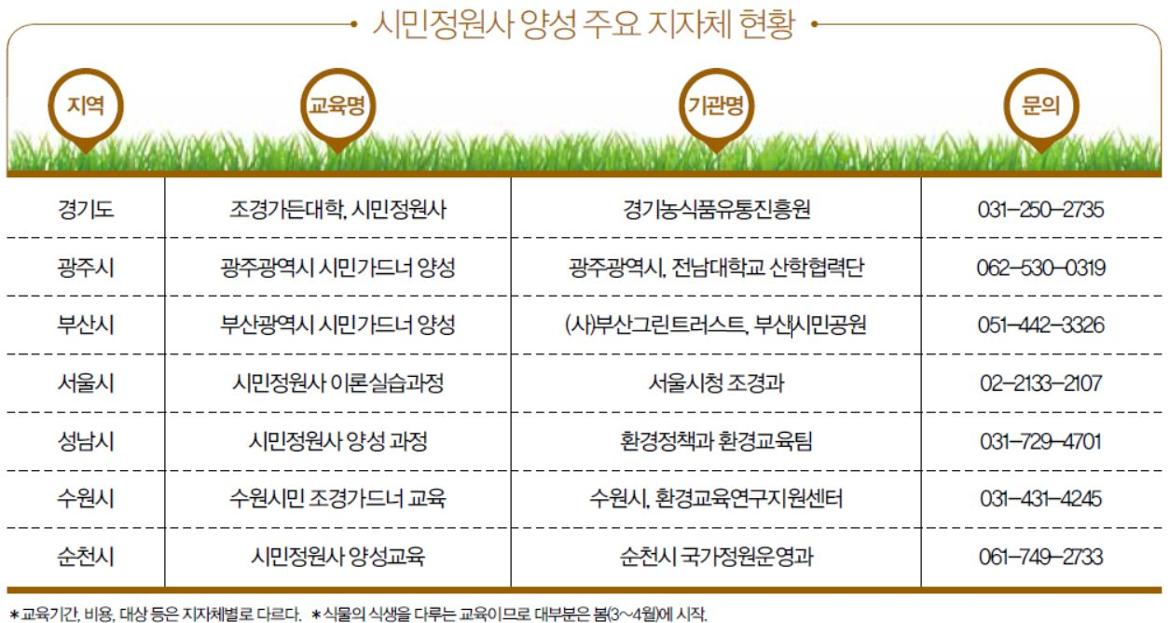 도시의 녹지가 늘어나면서 각 지자체에는 시민정원사 혹은 시민가드너 양성에 열을 올리고 있다. 지역 주민에게 화초 등 식물의 생육에 대한 정보와 전문지식을 제공하는 대신, 일정시간 이상 자원봉사나 재능 기부를 통해 이들을 지역주민을 위한 녹지공간 형성에 활용하는 방식이다.
