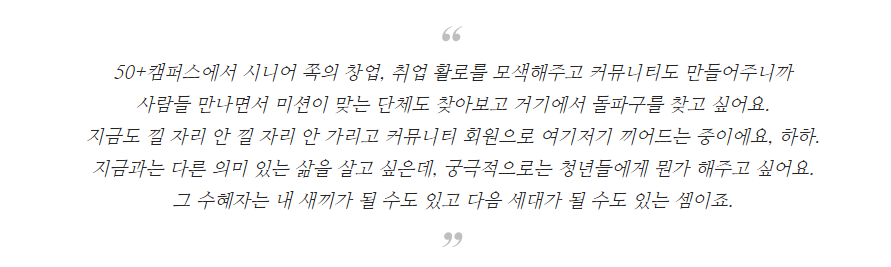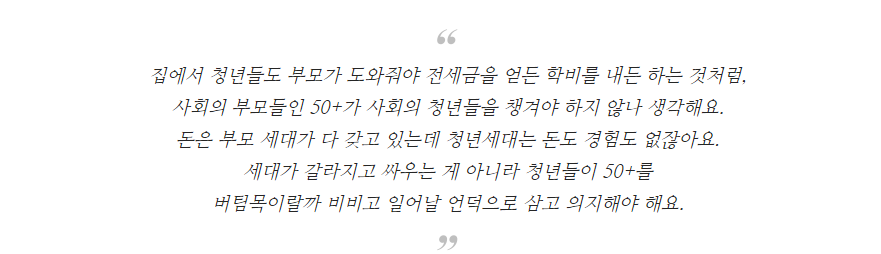 50+세대들은 자식세대를 위해서, 내 자식이 아니라 사회에 있는 자식들을 위해 뭐라도 해야 하지 않나하는 생각이에요.