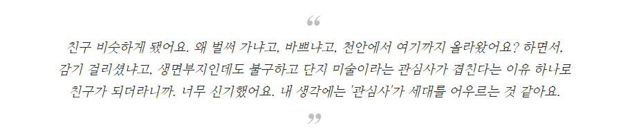 예술이 사람을 고양시키고, 힐링시키고, 영감 주는 사회가 됐으면 좋겠어요. 딸이랑 미술관이고 전시회고 다니면서 제가 느끼고 배웠던 것들이 있거든요. 나