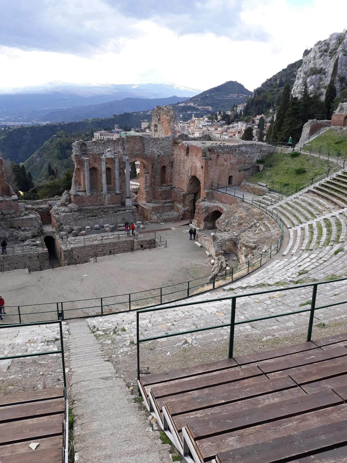 2,000여년 전 그리스 연극을 그대로 재현해 감상 할 수 있어 매우 인상적인 곳. 움베르토 1세 거리 동쪽 끝에 그리스 원형극장이 있다. 기원전 395년에 세워졌다. 완벽한 말 편자 모양으로 5개의 기둥, 2층의 뒷벽, 코린트 양식의 기둥머리 구성되었으며 타우로 산의 암벽을 깎고 돌을 쌓아 건축했다.
