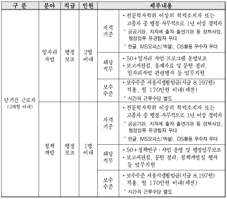 서울특별시 출연기관인「재단법인 서울특별시 50플러스재단」에서 단기간 근로자를 다음과 같이 공개모집 하오니 많은 응모 바랍니다.