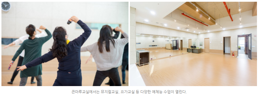 더이상 설명이 필요 없는 예체능실. 춤이나 요가 등의 신체활동 프로그램이 가능한 82㎡ 규모의 공간.