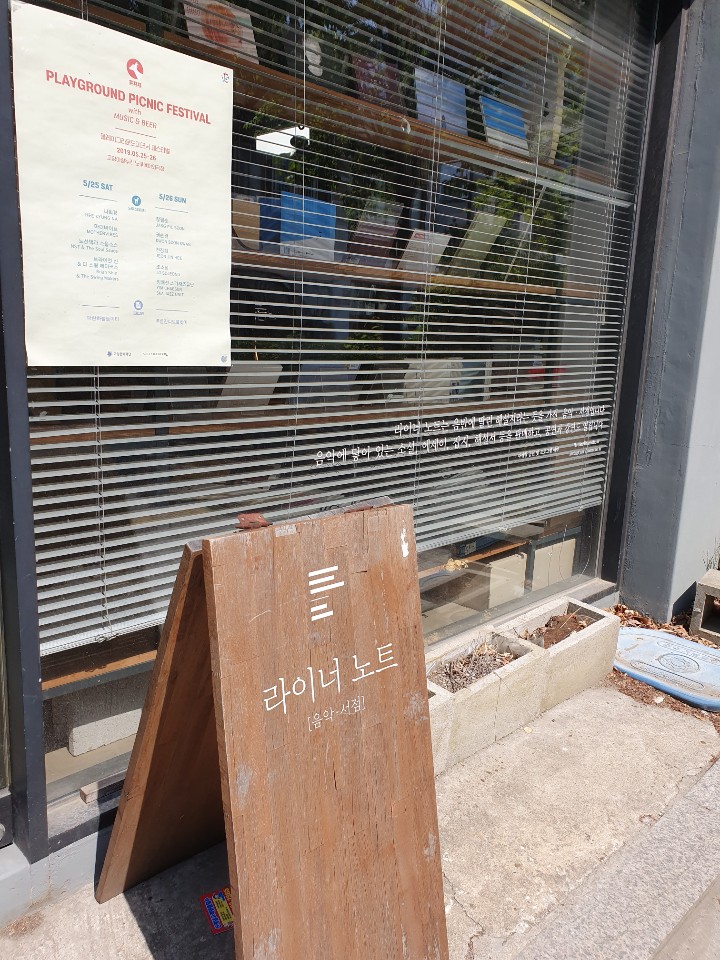 골목길을 꺾어 돌아 만난 두 번째 집은 음악전문서점 '라이너 노트'. 초보자여도 기타를 배울 수 있고 재즈를 들을 수 있는 곳, 공연도 열리는 서점이다.