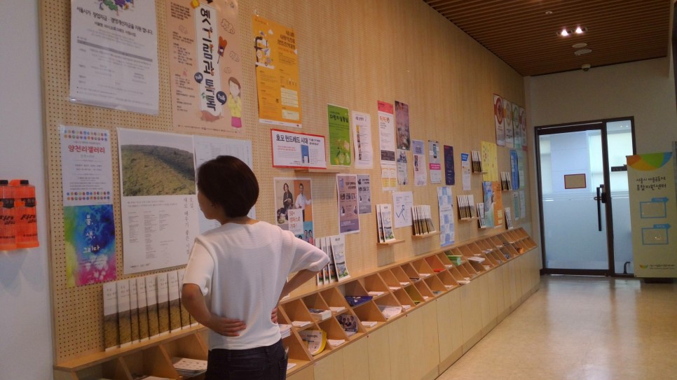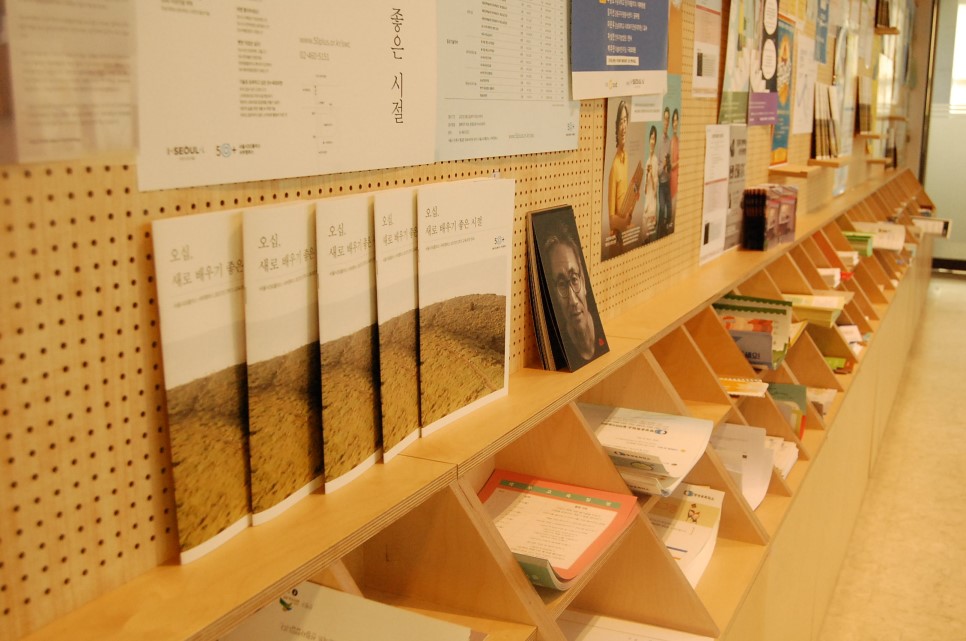 50+상담센터 앞에는 누구나 홍보물을 부착할 수 있는 벽과 인쇄물 비치대가 큼직하게 자리하고 있다.