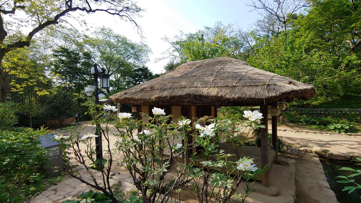 초가와 하얀 모란이 소박하지만 누추하지 않다.