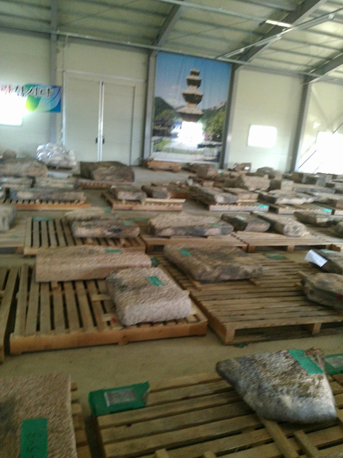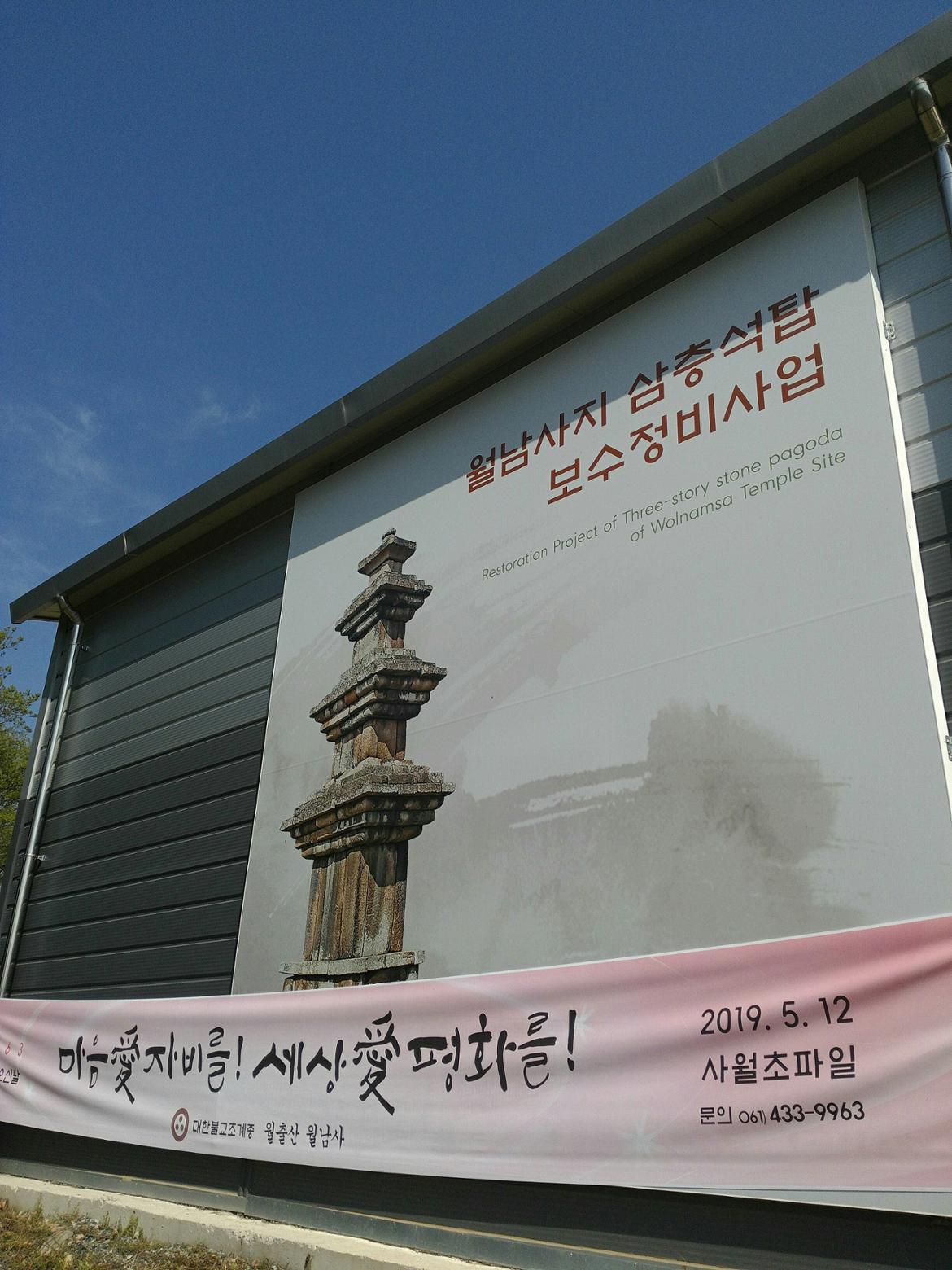 월남지3층석탑 보수를 알리는 현수막 사진                                             해체해 놓은 석탑 부재들
