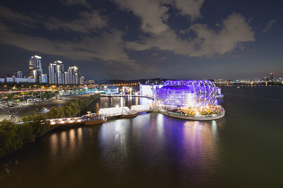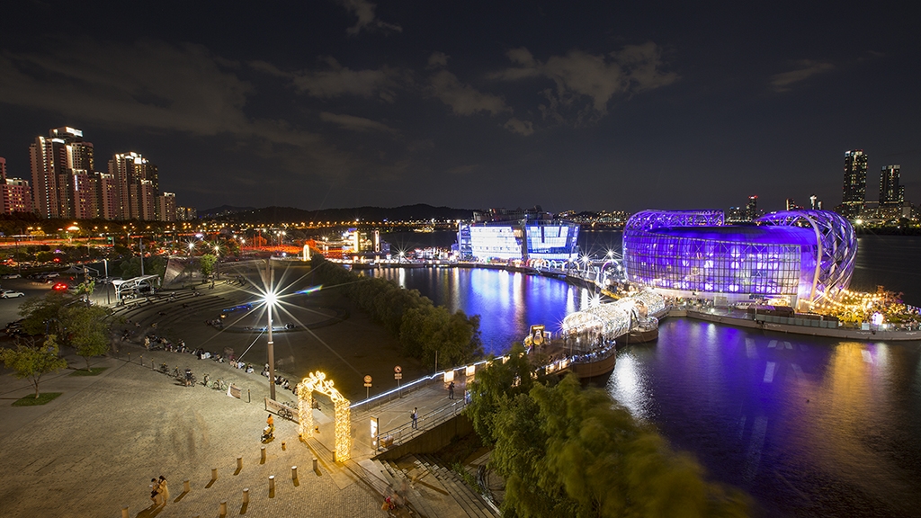 해가 기울면 꽃을 형상화하여 조성한 ‘세빛섬’의 미디어 파사드쇼가 더욱 화려해 진다.