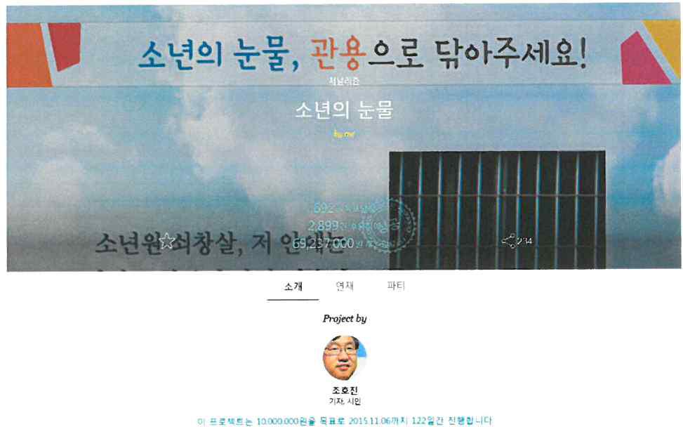 저는 2015년 7월부터 11월까지 4개월 여간 〈오마이뉴스〉와 다음 스토리펀딩에서 〈소년의 눈물〉이란 제목으로 소년범과 거리소년 등의 위기 청소년에 대한 이야기를 연재해 3천여 명의 독자로부 터 7천여만원을 후원 받았습니다.
