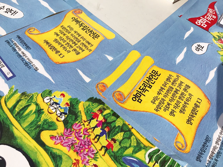 김정은 함께 해주셔서 엄마학교협동조합이야말로 기쁩니다. 우스갯소리로 남편보다도 아빠학교협동조합 조합원분들을 더 많이 만난다는 이야기를 하곤 합니다. 서울 50+축제 2017 준비과정에서도 목표가 분명한 두 단체가 함께하니 아이디어가 끝없이 이어졌습니다. 정말 함께해서 즐거웠던 행사입니다. 영상을 담당해주는 분이 계셨고, 콘텐츠라이터로 독립선언문을 구성해주신 분, 홍보와 진행을 맡아주시는 분 등 엄마학교협동조합 조합원 한명 한명이 모두 한 마음으로 참여해서 얻은 성과입니다. 명함, 엄마(아빠)독립선언서 뒤의 엄마지도, 스티커 등의 그림을 그린 사람은 제 딸이기도 합니다. 뒤늦게 그림을 공부하기 시작한 딸은 <엄마 난중일기> 제작 때부터 제게 큰 힘이 되어 주었는데, 엄마학교협동조합을 통해 더욱 큰 가정의 의미를 만드는데 딸과 함께 참여하고 싶어 제가 적극 참여를 권했답니다. 이번 서울 50+축제 2017은 강의와는 다른 엄마학교협동조합의 폭넓은 역량을 마음껏 펼칠 수 있는 장이 되어 주었습니다.