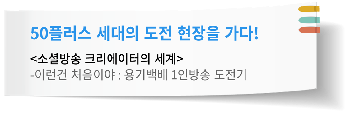 소셜방송 크리에이터, 1인 미디어로 활동하기 위한 50플러스 세대들의 새로운 도전을 응원하며 의미있는 결과를 가져오길 기대해본다.