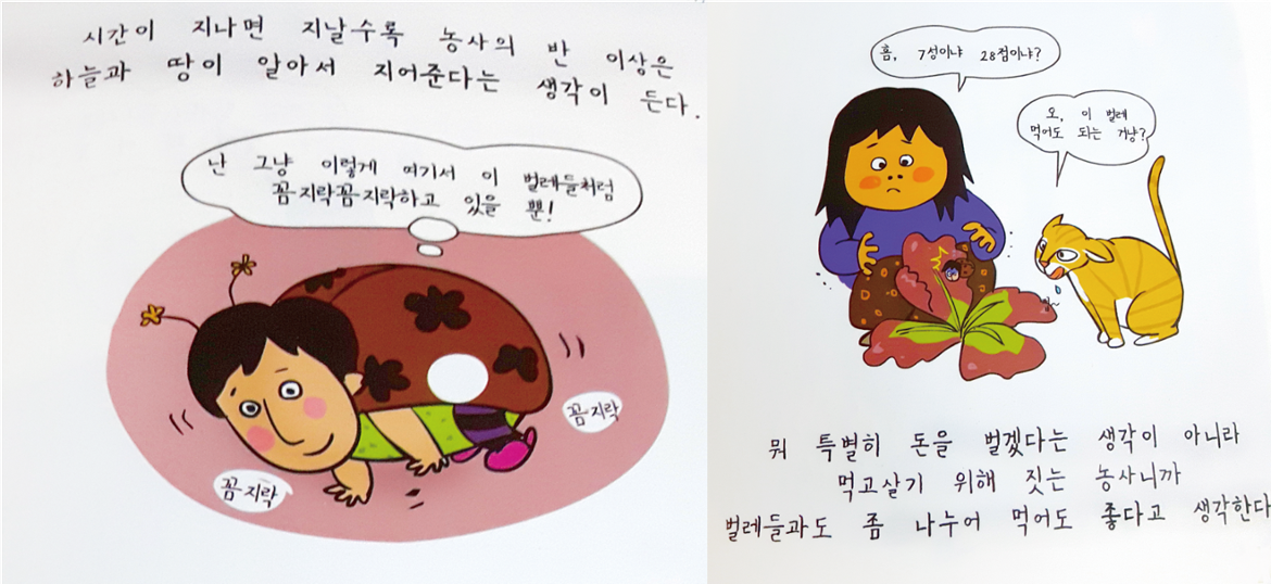 권경희와 임동순, 두 여자는 마루야마 겐지의 촘촘하고 무서운 충고와 사전준비의 말을 하나도 모르는 사람처럼, 아니 알고도 일거에 모두 뒤집어버리는 식으로 귀향을 완성했다. 시골 살이에 대한 경험은 전혀 없고, 돈도 없고, 살 집도 없고, 귀촌 자체에 대해 깊이 생각하지도 않았다. 가자!고 마음먹은 지 한 달 만에 득달같이 그냥 동네 빈 집으로 살러 들어가는 패기를 보여준다. 한 장 씩 만화책을 넘기노라면 <시골은 그런 것이 아니다>에서 받은 서늘한 두통과 불편한 마음이, 불안이 일거에 화락 날아가 버린다. 이웃에 무서운 범죄자가 살고 있을 수 있으니 자는 방을 요새화하라는 마루야마의 충고도 좋지만, 덜덜 떨면서도 고양이 두 마리와 술 취한 남자를 대하는 두 여자의 모습이 더 실감나고 귀엽다. 못 먹을 풀과 먹을 풀을 헷갈리면서도 신나게 채취, 수렵해 요리를 해먹고 벌레가 나와 꺄악꺄악 대면서도 즐겁게 별을 바라보는 모습이 유쾌하기 짝이 없다. 덩달아 시골로 내려가고 싶은 마음이 들게 한다.
