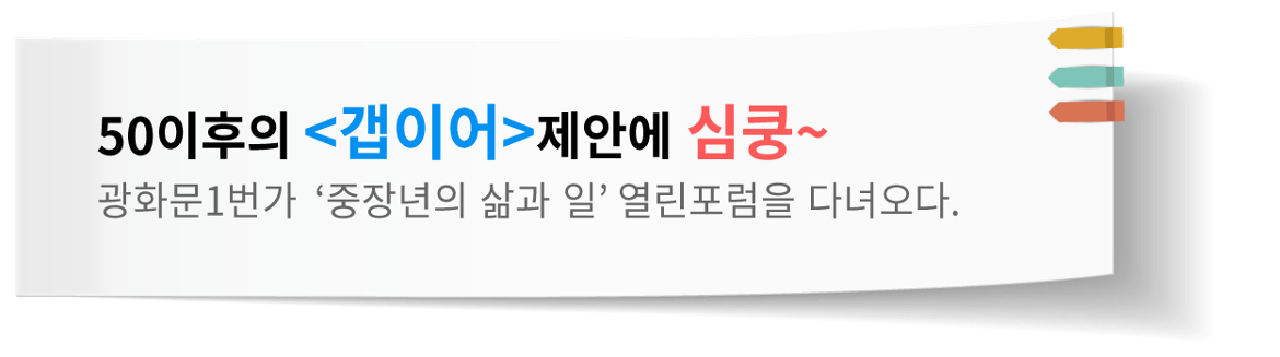 새 정부가 들어서면서 국민과의 소통을 우선순위로 약속했다. 그리고 그 약속을 지키키 위해 ‘광화문1번가’라는 국민소통공간을 만들어 50일 동안 시민들의 다양한 목소리를 들었다. 지역이나 지위, 성별에 구별 없이 대한민국 국민이라면 누구나 참여한 이 장정의 마지막은 ‘중장년의 삶과 일’을 주제로 한 열린 포럼이었다. 나라와 회사, 가족을 위해 앞만 보고 달려온 중장년의 인생. 그러다 나이가 들고 일선에서 물러나니 밥 먹고 자는 시간을 제외해도 8만 시간이 남는단다. 이  넘치는 시간을 어떻게 활용해야 할지 중장년층의 삶과 일에 대한 다양한 고민과 모색이 이어졌다.