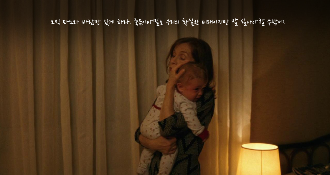 영화 <다가오는 것들>은 오프닝에서 무덤과 묘비로 나타나는 죽음으로 시작해서 딸의 아이를 품에 안고 노래하는 삶의 장면으로 끝난다. 미래는 죽음과 삶이 반복된다.