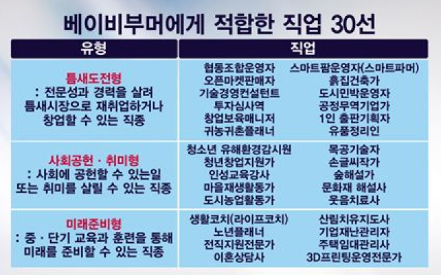 베이비부머에게 적합한 30개 직업은 ‘틈새도전형’, ‘사회공헌‧취미형’, ‘미래준비형’ 등 세 가지 유형으로 나뉜다.