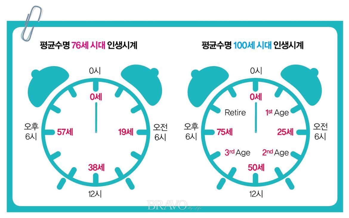 평균수명 76세 시대의 인생시계를 4등분하면 오전 6시에 해당하는 나이는 19세다. 오전 6시는 기상시간에 해당하며 19세의 나이는 사회활동을 시작하는 나이를 의미한다. 그리고 정오가 되면 점심을 먹고 잠시 쉬고 오후 6시가 되면 퇴근시간이다. 인생시계에서 오후 6시, 즉 퇴근시간은 퇴직시기를 의미한다. 조퇴하는 사람도 있고 야근하는 사람도 있지만 어쨌든 오후 6시는 공식적인 퇴근시간, 즉 퇴직시기다. 하지만 평균수명 100세 시대가 되면 시간의 상징은 변한다.