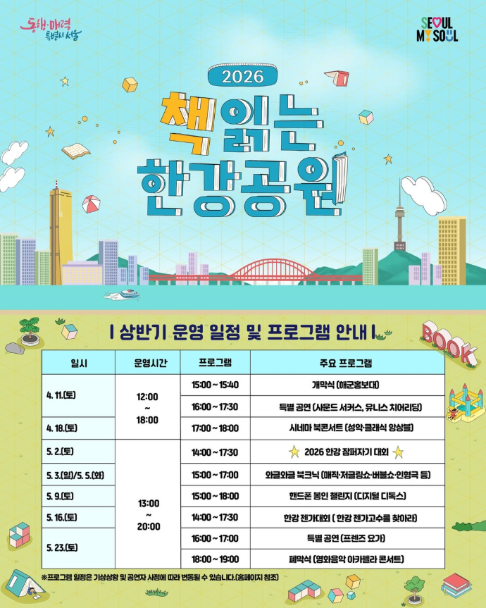 누구나 편하게 독서 및 문화공연 등을 통해 한강의 노을과 윤슬을 즐길 수 있는 '책 한강'프로그램