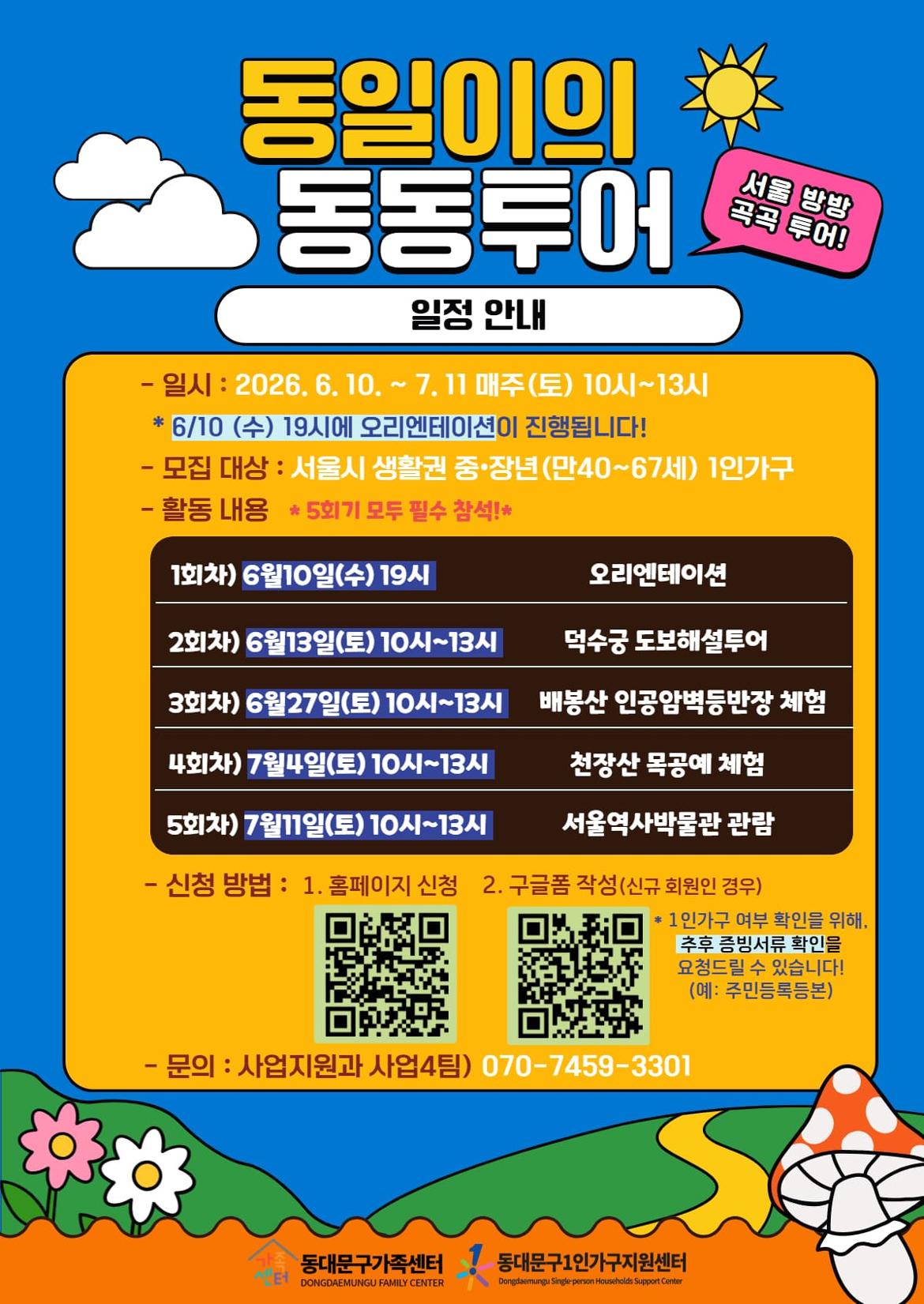 - 1회차: 6월10일(수) 19시 오리엔테이션(동대문구가족센터 제2센터 마을교실)