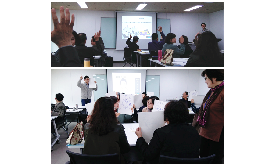 초상화를 그리며 여기저기서 웃음과 탄성이 터져 나오는 걸 보니, 어느새 강의실은 시끌벅적^^
