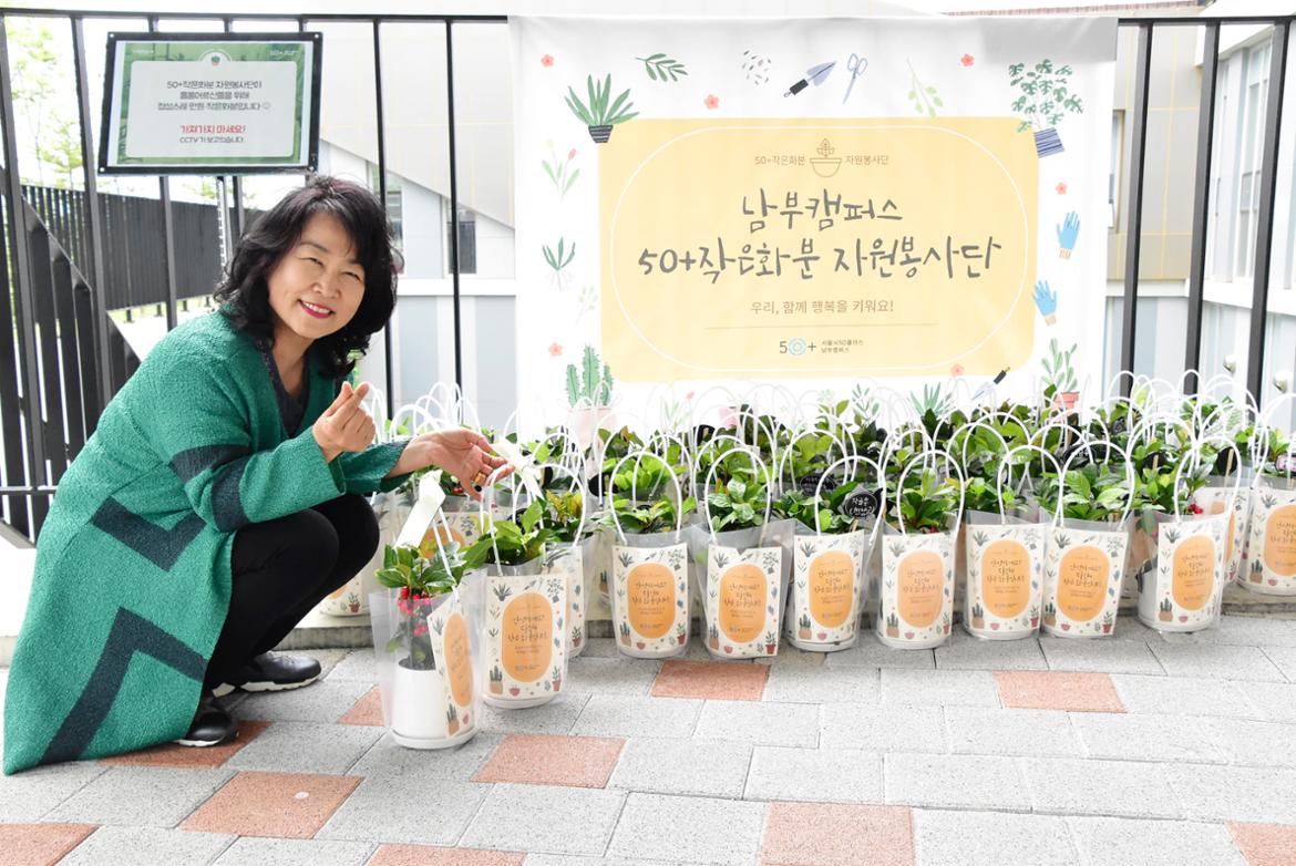 코로나바이러스 감염증 상황이 지속됨에 따라 힘들어하는 지역 화훼 소상공인과, ‘코로나 블루’로 우울감을 겪는 소외된 이웃이 계속 늘어나는 시기였습니다. 이때, 남부캠퍼스는 봉사 의지가 있고 사회에 보탬이 되고자하는 50+의 욕구를 발견해, 50+가 안전하게 활동할 수 있는 비대면 봉사활동 [50+작은화분 자원봉사단]을 준비하게 되었습니다.
