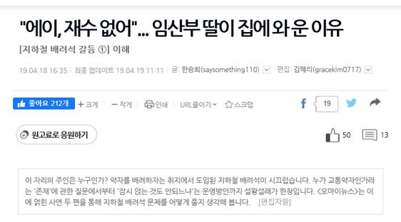 말도 잘하고 대단해 보이는 수강생들 틈에서 힘들었지만, 나는 한 주도 빠짐없이 수업에 참여했고 2주마다 한 편의 에세이가 탄생했다. 퇴고한 에세이를 매체에 투고해보라는 강사님의 조언에 따라 ‘오마이뉴스’에 ‘공간’에 관한 에세이를 투고했다. 주제는 사회적 문제를 다룬 ‘지하철 배려석 갈등’에 관한 것으로, 약자를 배려하자는 취지에서 만들어 놓은 배려석, 특히 임산부석을 둘러싼 문제에 대해 생각해보자는 내용의 에세이였다. 며칠 후 ‘오마이뉴스’ 담당자로부터 에세이가 채택되었다는 연락이 왔다.