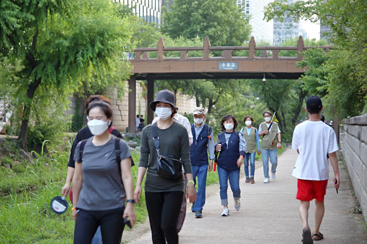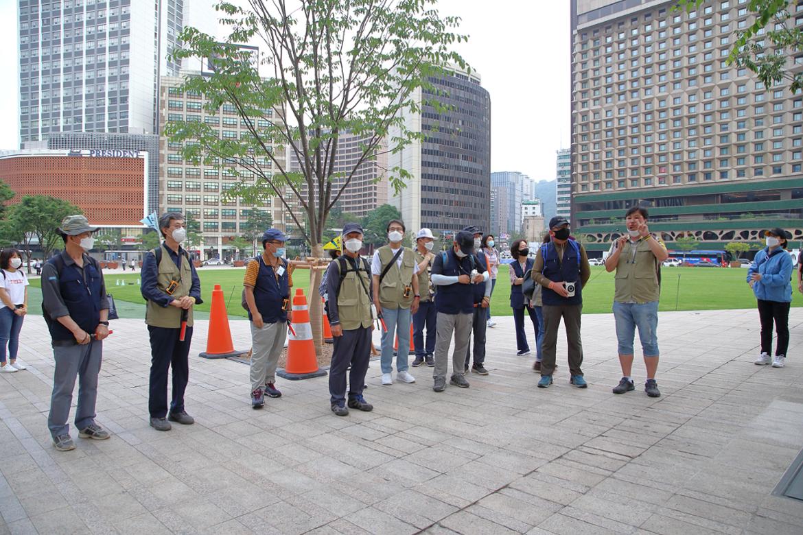 햇빛이 부드러워진 오후라 걷기가 좋았습니다. 청계천에 접어드니 시민들이 오후를 즐기고 있는 모습이 보입니다. 조금 긴장이 느껴지지만, 마스크를 끼고 거리를 유지합니다. 세 팀으로 나뉘다 보니 벌써 거리가 조금씩 벌어집니다. 주강사는 앞에서 인솔하며 주요 지점에서 설명하고, 부강사는 중간중간 점검하며 팀을 보살핍니다. 혹시 위험한 사항은 없는지 이탈자는 없는지 마치 양떼를 모는 목동처럼 예리하게 주변을 살피고 참가자들을 챙깁니다.
