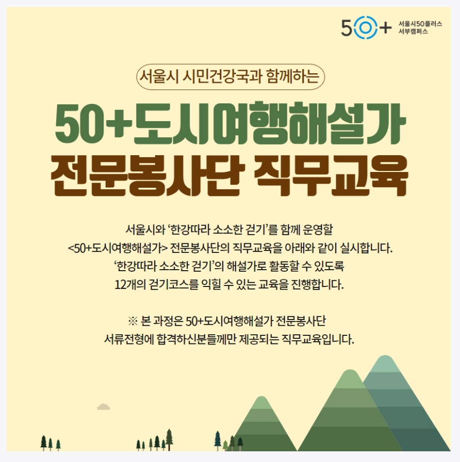한강따라 소소한 걷기’는 서울시50플러스 서부캠퍼스가 서울시 시민건강국 건강증진과와 (사)숲을찾는사람들이 함께하는 걷기 프로그램입니다. 현재 청계천에서 여의나루에 이르는 한강길이 12개 코스로 구성돼 진행되고 있는데요, 서부캠퍼스 ‘50+도시여행해설가 자원봉사단’이 운영단에 참가해 함께하고 있죠. 50+도시여행해설가 양성과정이나 이와 비슷한 외부 과정을 수료하고 여행 해설 경험이 있는 시민들이 12개 걷기 코스에 대한 직무교육을 통해 해설가로 활동합니다.