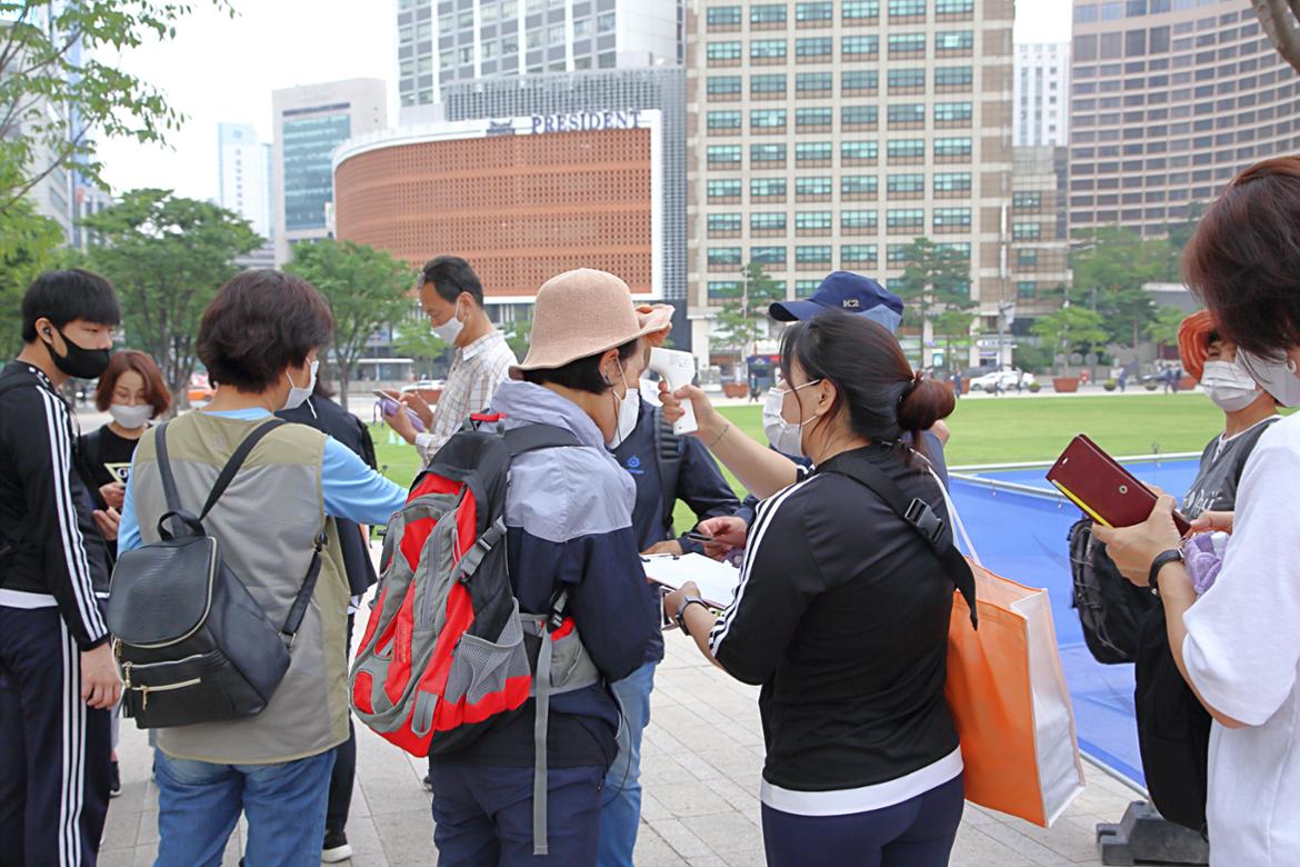 걷기를 시작하기에 앞서 신청자 확인을 하고 준비할 것들을 챙깁니다. 일단 스마트폰에 걷기앱인 ‘워크온’을 깔고 사용법을 익힙니다. 이날은 동대문보건소에서 열 체크를 하는 등 걷기에 앞선 준비를 도왔습니다.